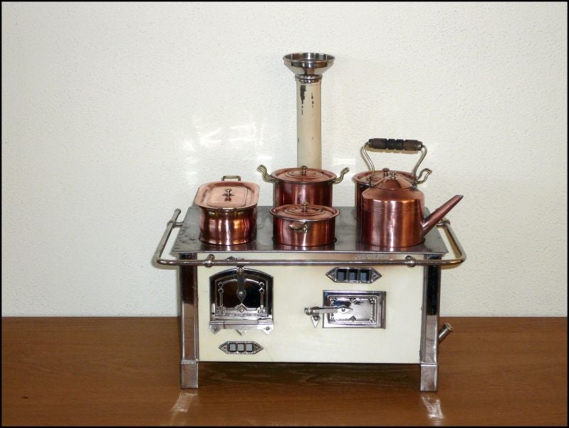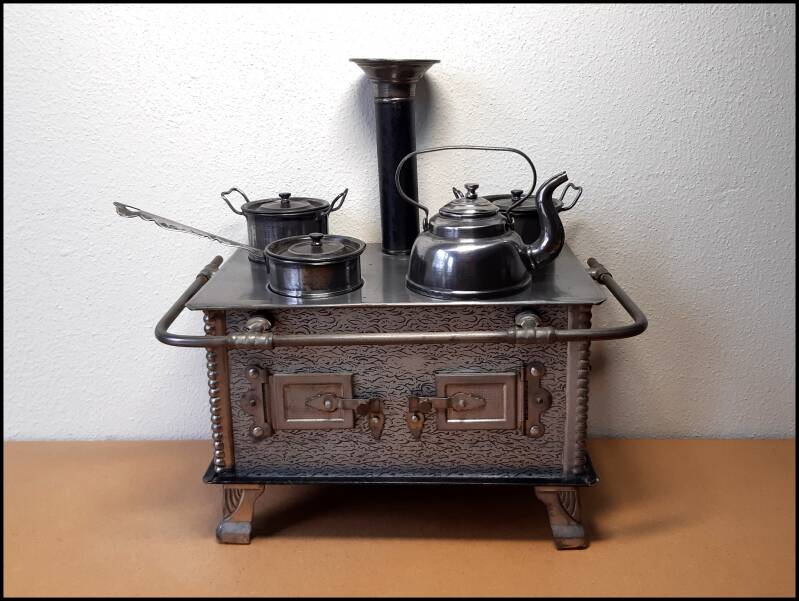 Leuk klein zwart blikken fornuisje met eveneens zwart gelakte kookplaat. De pannetjes zijn van blik. Leuk detail is het dekselknopje die gevormd is door 'n opgerold stukje blik. De kap van de kachelpijp is van messing. Het goudkleurige deurtje is voorzien van een ingestanst motief. Dit fornuisje is gemaakt door C.F. Dieterich. Datering jaren 20.