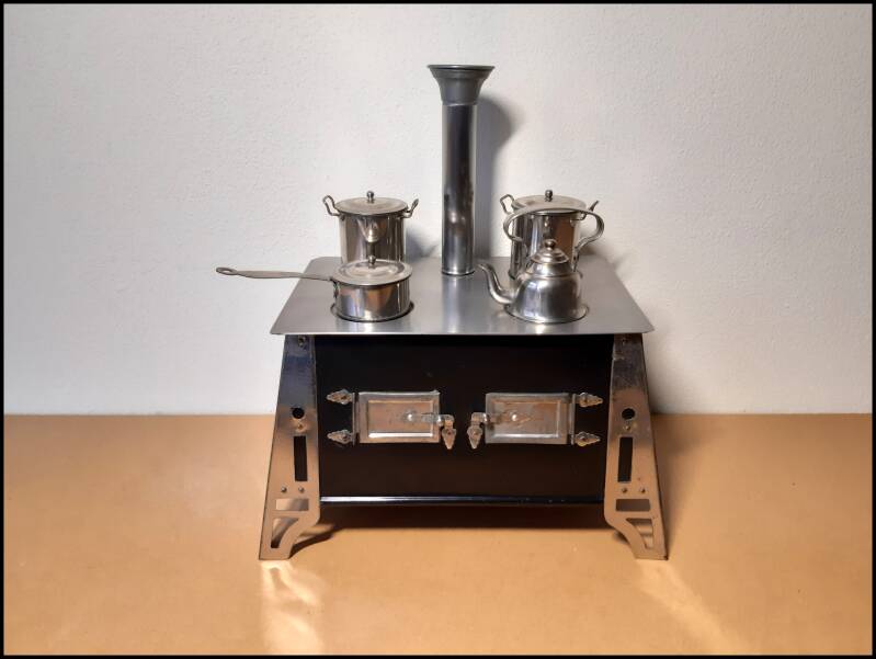 Zwart gelakt blikken fornuisje met blank gepolijst kookblad met daarin gestanst "Gezetz Geschutzt" De hoeklijsten die in de pootjes overgaan zijn sierlijk gevormd en vernikkelt evenals het deurtje. De blikken pannetjes hebben een messing deksel en messing handgreepjes. Het waterketeltje is eveneens van messing. Op de kookplaat staat een tes met daarop een leuk passend strijkboutje. De kachelpijp is van blank metaal en voorzien van een messing kap. Dit fornuisje wordt met spiritus gestookt door middel van een twee pits schuifbrander die vanaf de zijkant in het fornuisje wordt geschoven en de twee voorste kookgaten bedient. Dit fornuisje dateert uit de jaren 1920-1930. De maker is waarschijnlijk Leo Prager.