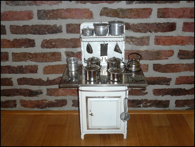 Oranje met wit gelithografeerd fornuisje. Het kookblad en de kachelpijp zijn wit gelakt met een zweempje lichtblauw. Het deurtje, de pootjes en de kap op de kachelpijp zijn van blik en die zijn vermoedelijk vernikkeld geweest. De pannenset is van blik dat vroeger vernikkeld is geweest. Het fornuisje werd met spiritus gestookt door middel van een potbrandertje met steel, deze ontbreekt helaas. Dit fornuisje dateert waarschijnlijk uit de jaren 20 van de vorige eeuw. De maker is ons niet bekend.