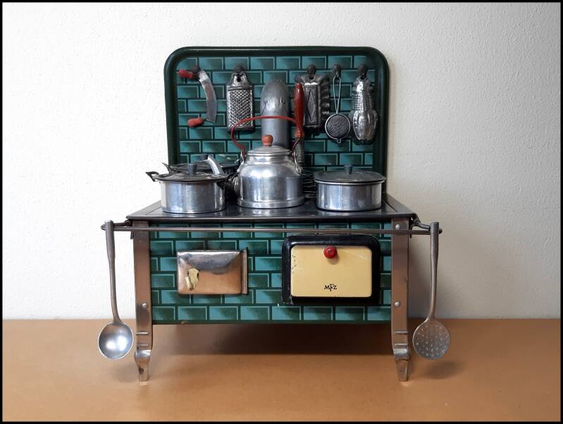 Ivoorkleurig fornuisje compleet met pannetjes, branders, bakvormpjes en raspje. Het fornuisje is voorzien van een gelithografeerd tegelmotief in 2 kleuren blauw. De grote ovendeur kan open en is voorzien van 'n houten roodgelakte knop. De kleinere deurtjes zijn in reliëf aangebracht en kunnen niet open. Het fornuisje wordt met Meta blokjes gestookt. De letters MFZ zijn de initialen van Martin Fuchs uit Zirndorf. Dit fornuisje dateert uit de vijftiger jaren.
