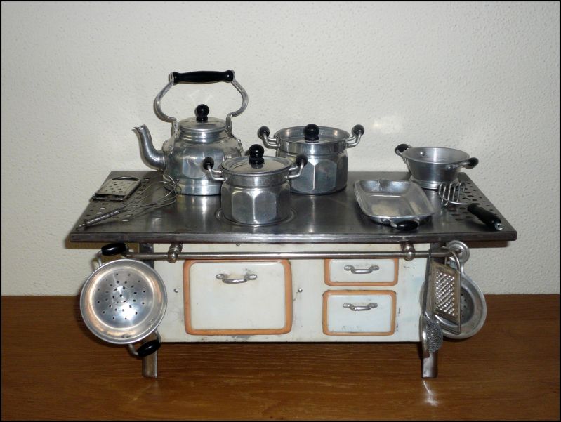 In tegelmotief gelithografeerd groen blikken fornuisje met blank gepolijste kookplaat.Het fornuisje heeft een veiligheidsstang en vernikkelde hoeklijsten die overgaan in de poten. De pannenset en waterkoker zijn van aluminium met verweerde vernikkelde deksels. Aan de achterwand hangen bakvormpjes en divers keukengerei. Het fornuisje wordt gestookt met vaste spiritus (Esbit). Dit fornuisje is gemaakt door Martin Fuchs uit Zirndorf eind 1940 begin jaren 50.